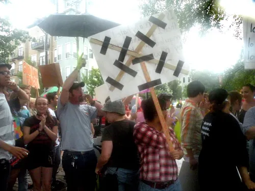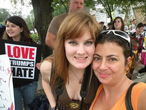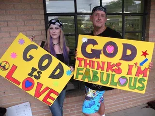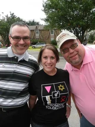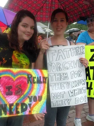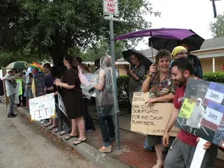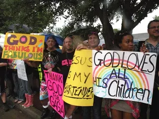 Coming all the way from Kansas to the doors of The Resource Center of Dallas to protest, hundreds of friends of our community came out to counter protest. "Hell Freezes Over" generated extreme hype, and amazingly enough, raised an undisclosed amount of funds through corporate sponsorships and donations to fix the ice machine. Great timing! Sidewalk chalk rainbow colored cobblestones were created just before the rain hit to welcome the fanatics. Perhaps the most touching was the love and humor and fellowship that radiated from the crowds standing strong in the rain, determined to shower the opposition with a greater sense of pride. You have to see the pics to believe it...
